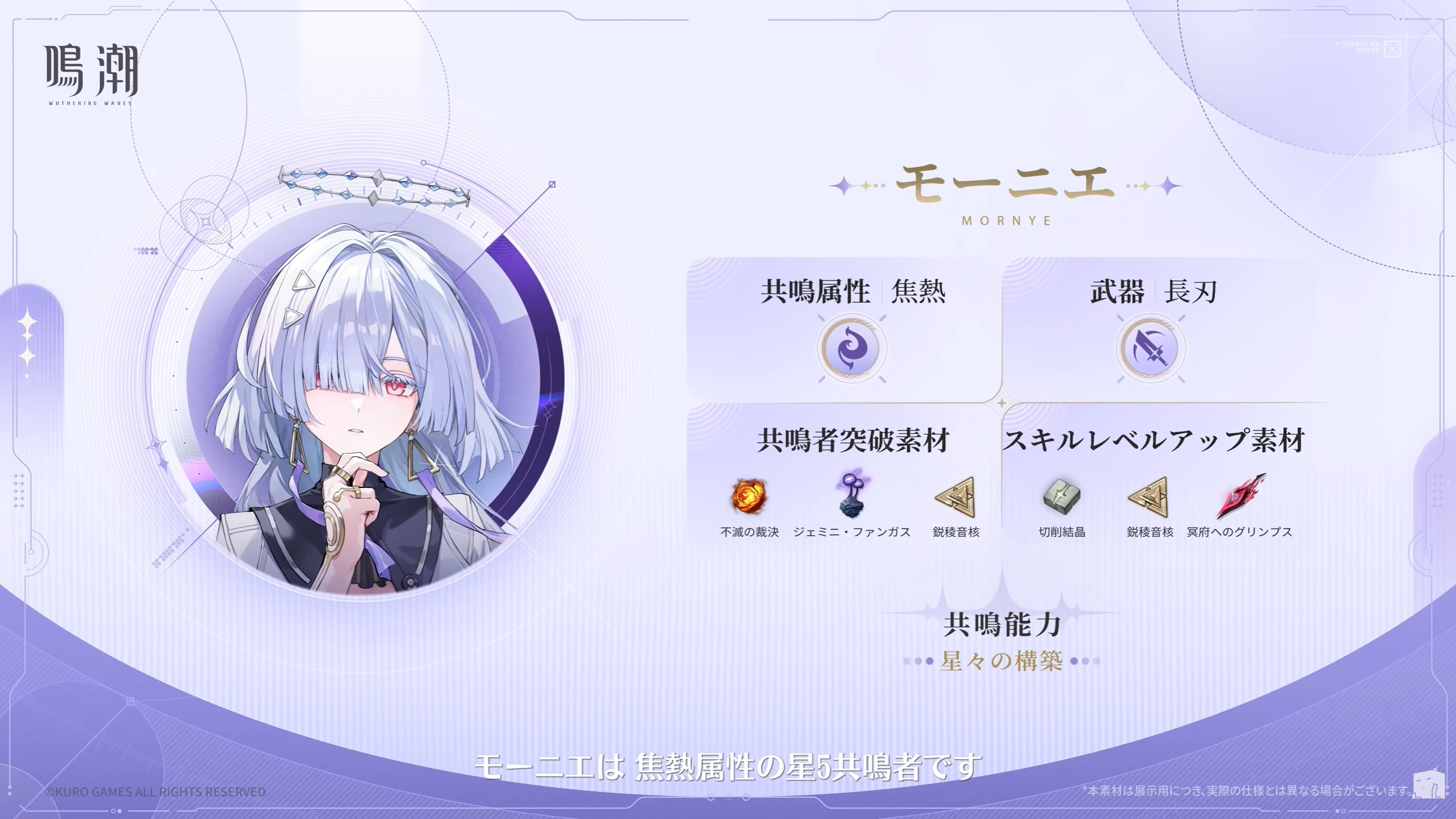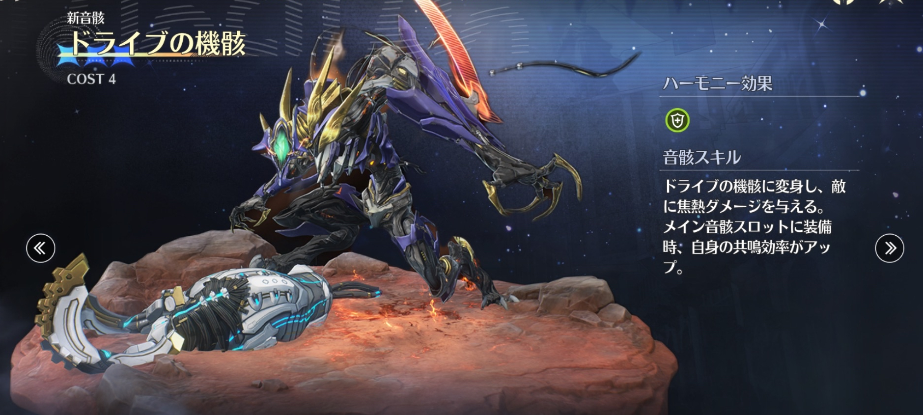 ドライブの機骸はスターブライト・リングの4cost枠になりそうです。メイン効果は共鳴効率UPということで、モーニエはショアキーパーと同じ共鳴効率によってバフ量が変わるキャラになりそうです。