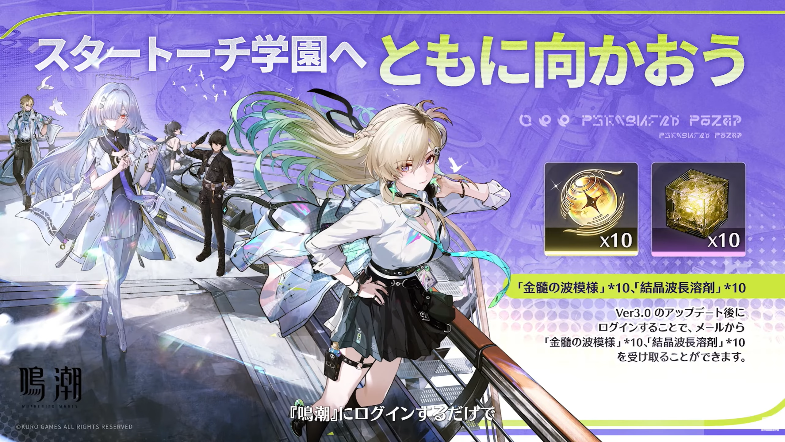 ver3.0アップデートが終わった後、1回ログインするだけで「金隨の波模様」×10、「結晶波長溶剤」×10もらえます。