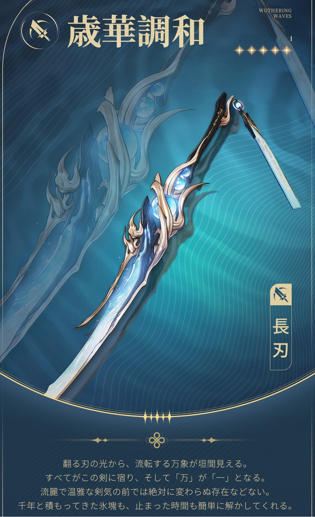 | 全属性ダメージ[12%~24%]アップ。 変奏スキルを発動する時、自身が共鳴スキルダメージ[24%~48%]アップする【歳月の重み】効果を獲得し、12秒間持続。 共鳴スキルを発動する時、自身が共鳴スキルダメージ[24%~48%]アップする【月日の恵み】効果を獲得し、12秒間持続。 | |