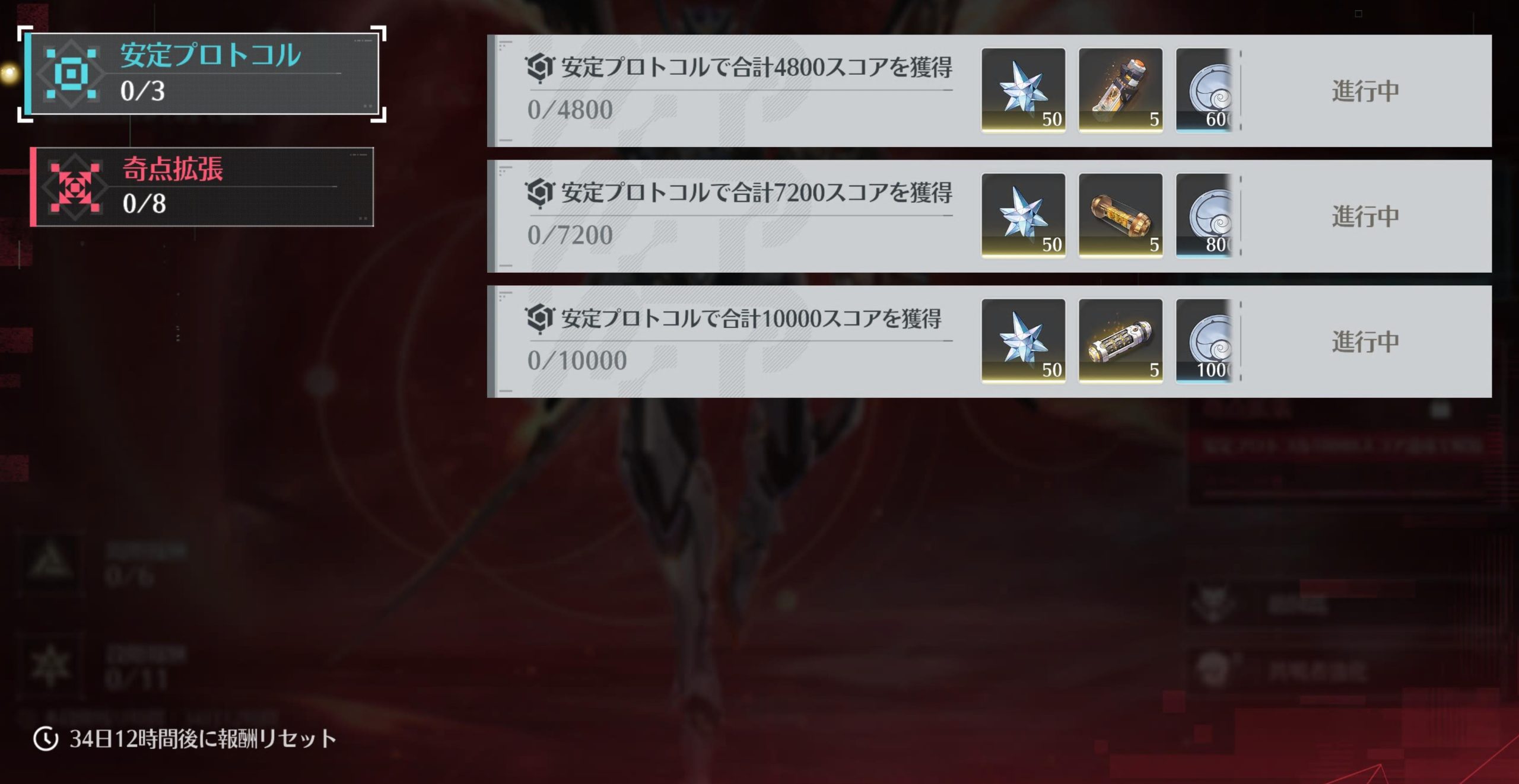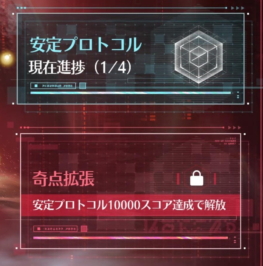 終焉マトリクスは『安定プロトコル』『奇点拡張』の2段階に分かれており、『安定プロトコル』で10000スコアを獲得することで『奇点拡張』へと続くことができます。そのため、まずは『安定プロトコル』を攻略することになります。